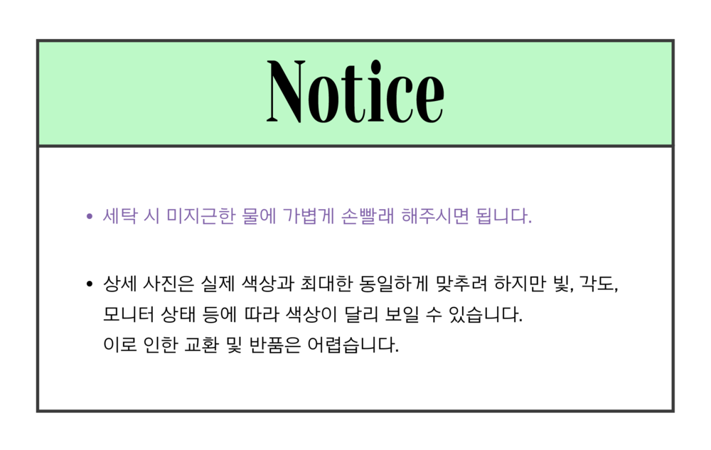 - 단순 변심의 경우 수령일로부터 7일 이내까지 교환∙반품이 가능합니다. (교환/반품비 고객님 부담)