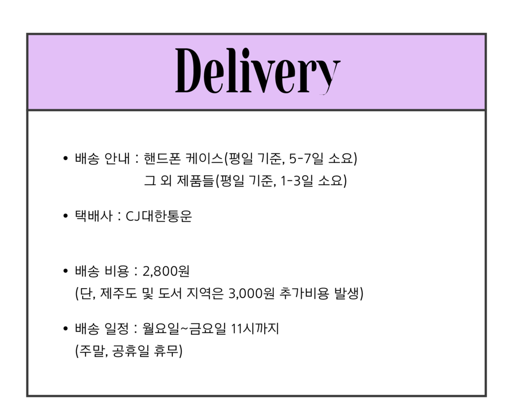배송 비용 ㅣ 2,800원 / 도서산간 지역 별도 추가 금액 발생